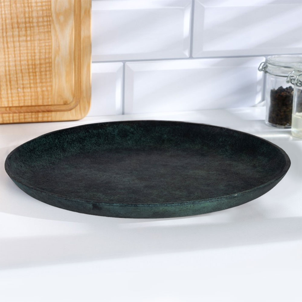 427155 Тарелка декоративная MALIMONO, H35, ?340, алюминий, зеленая патина создает в помещение уют и прекрасно дополняет интерьер квартиры или загородного дома, оформленный как в классическом, так и современном стиле. Продукцию, принадлежащую к дизайнерскому классу, создают только из самых качественных и безопасных материалов с использованием новейших технологий производства. В ней идеально выверена каждая деталь. Изделие преображает пространство, гармонично сочетая в себе уют, удобство и красоту. Этой стильной модели не страшны капризы моды — и через год, два, пять она будет смотреться также уместно.