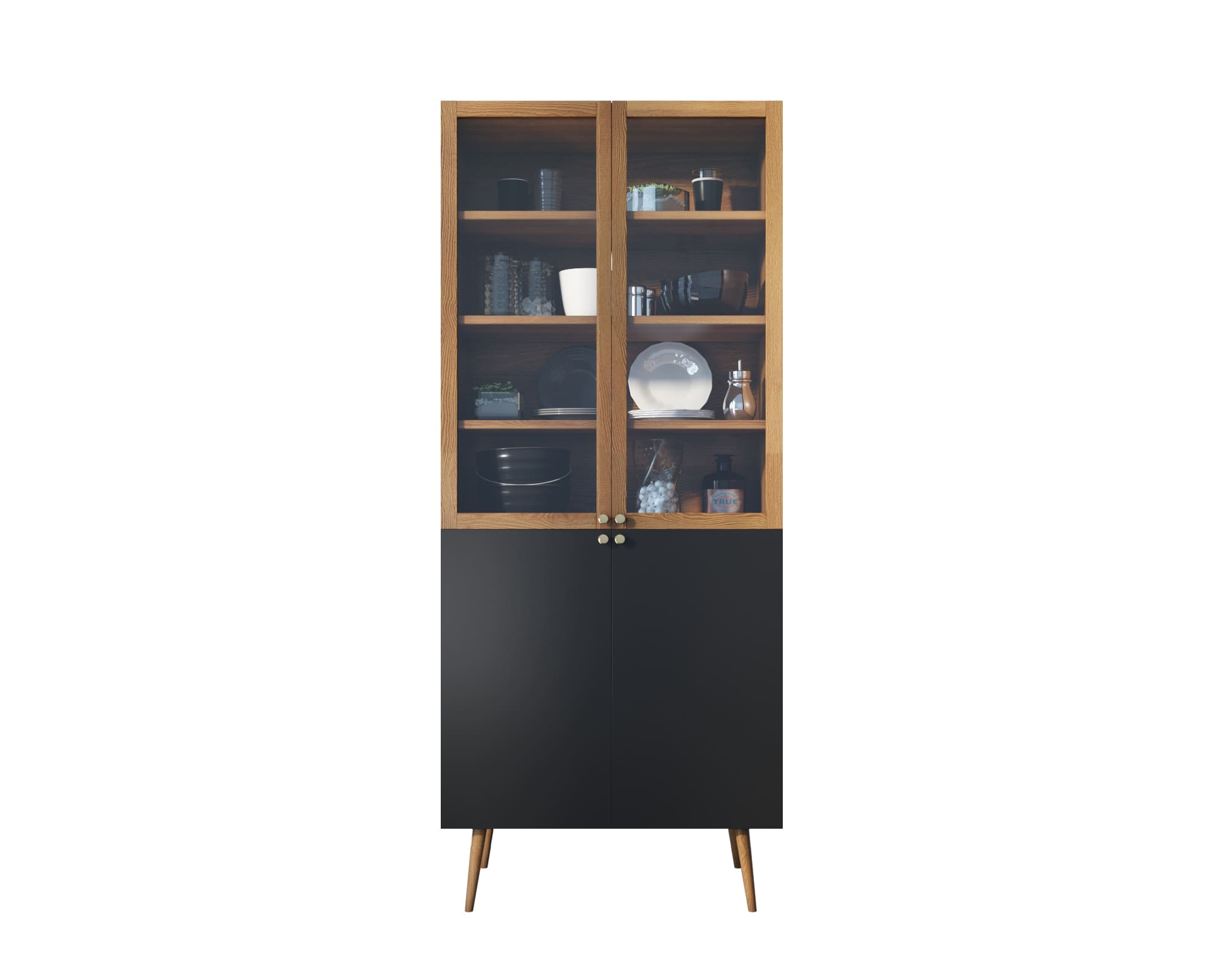 Малый буфет "Berber" имеет верхнее отделение с рифлеными дверками в раме из натурального ясеня и нижнее, дверки которого покрыты дизайнерским принтом. Пространство за дверками поделено на две секции, в каждой из которой есть съемная полка регулируемая по высоте в трех режимах.