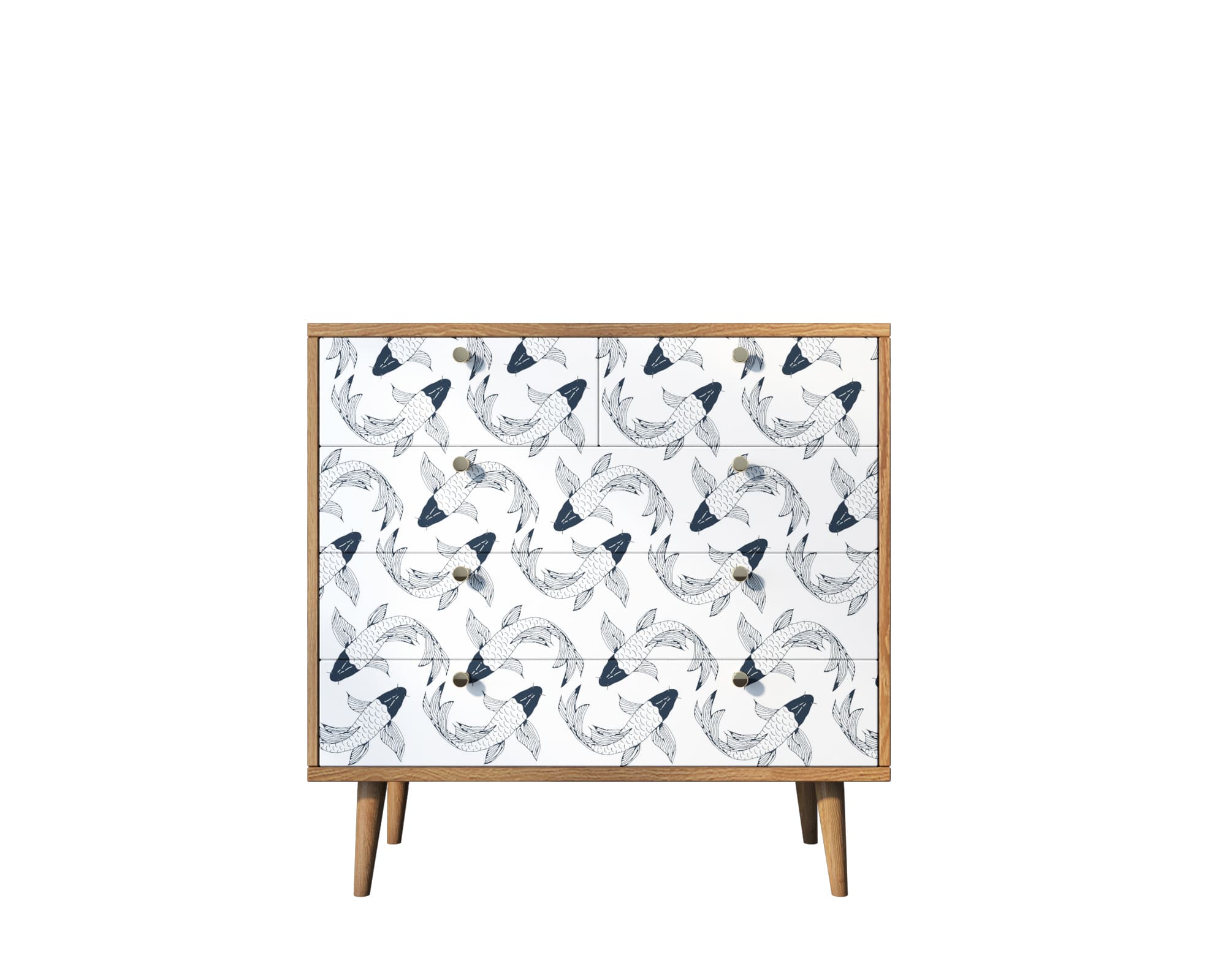 Компактная модель комода представлена пятью продольными ящиками с удобными ручками. Корпус прямоугольной формы выполнен из ЛДСП, а ножки изготовлены на основе натурального дерева. Комод привлекает внимание спокойным принтом на фасаде.