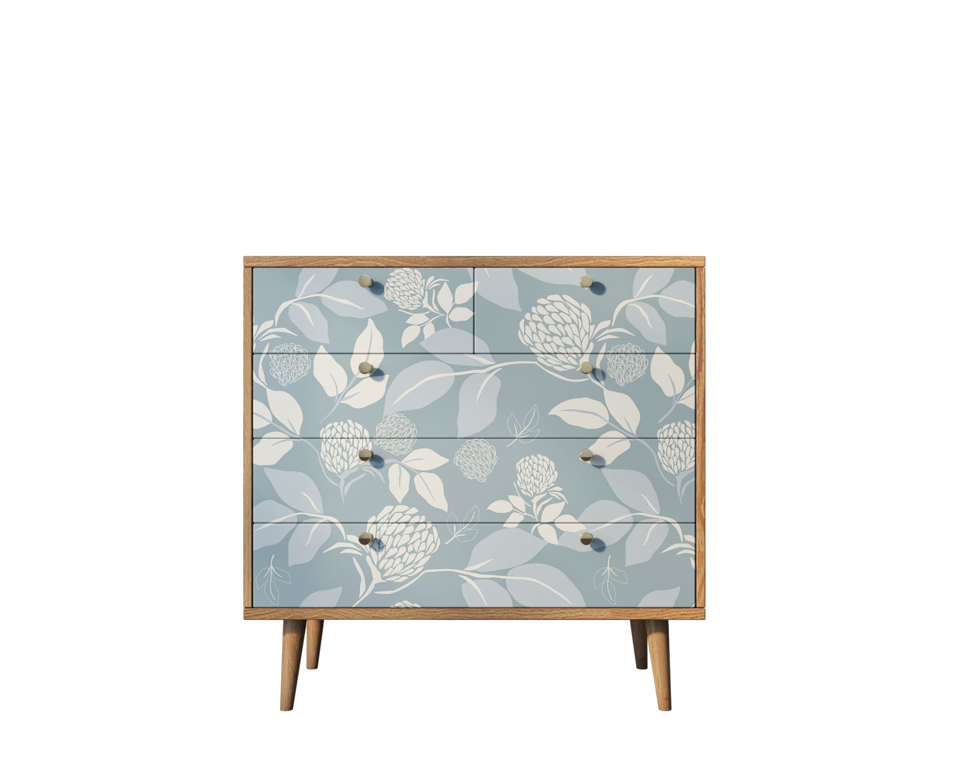 Компактная модель комода представлена пятью продольными ящиками с удобными ручками. Корпус прямоугольной формы выполнен, а ножки изготовлены из прочного массива ясеня. Комод привлекает внимание спокойным принтом на фасаде.