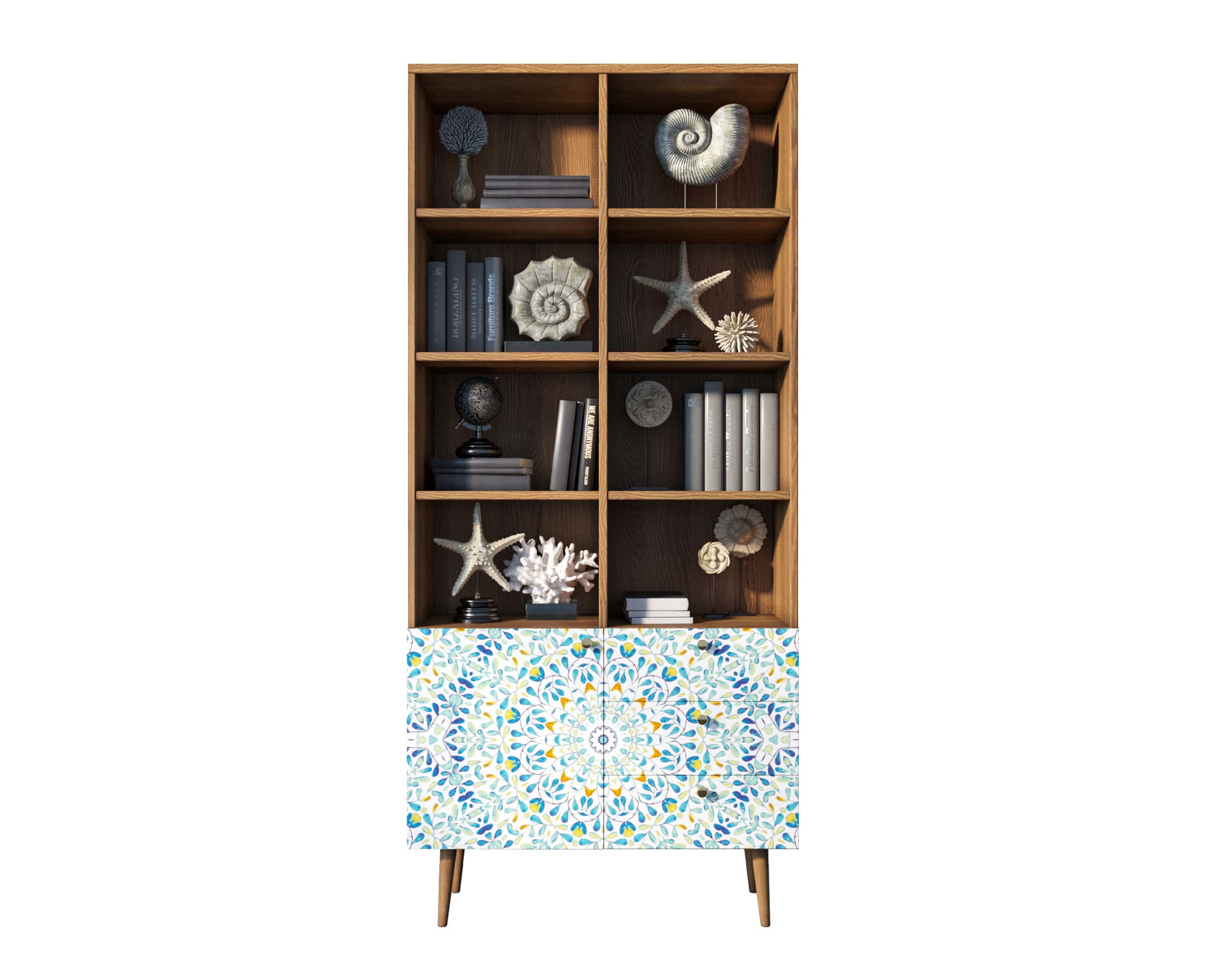 Стеллаж с дизайнерским принтом на фасаде имеет три небольших ящика полного выдвижения на шариковых направляющих. Левая секция за дверкой разделена полкой, которая регулируется по высоте. Ноги изготовлены из прочного массива ясеня.