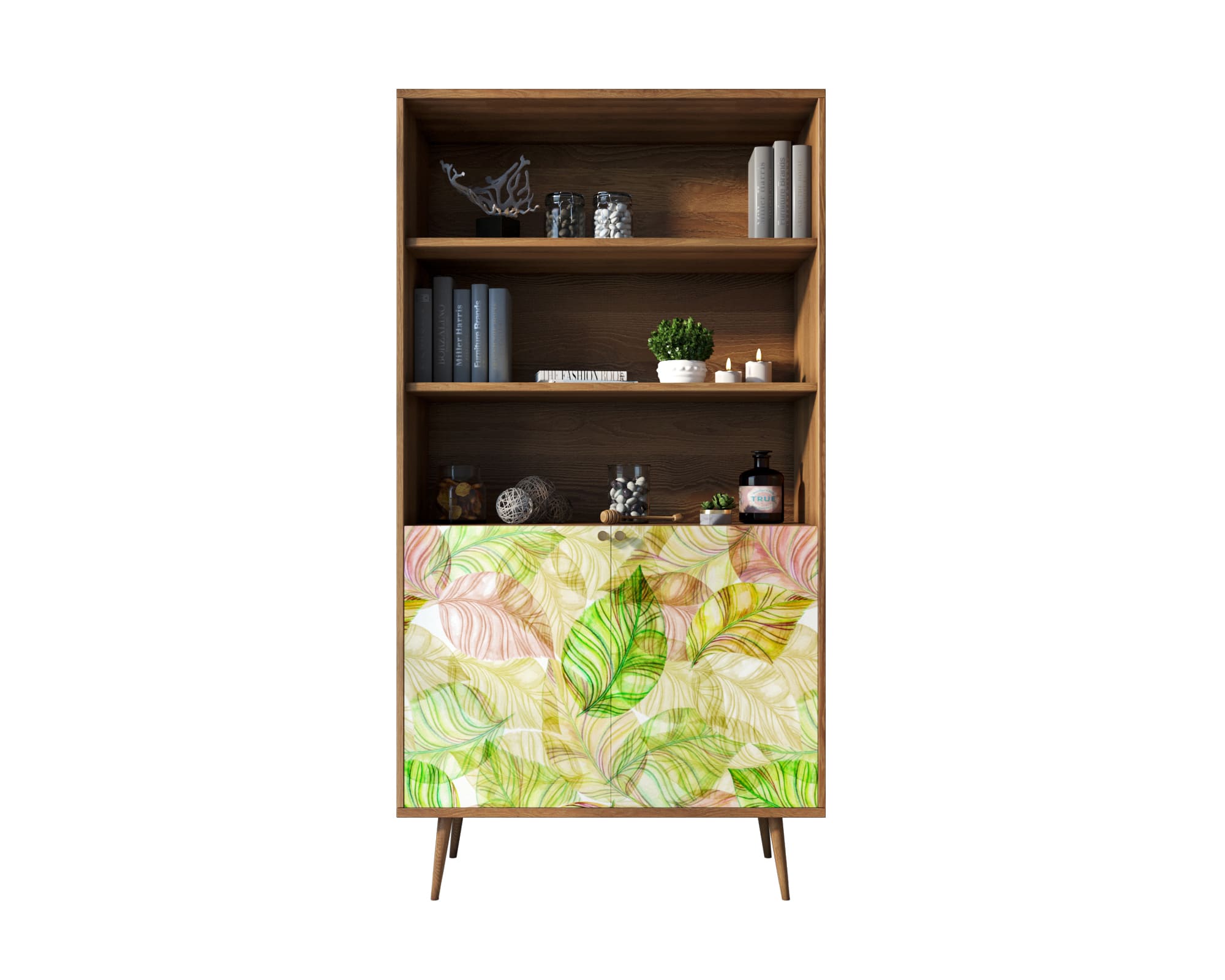 Стеллаж "Berber" визуально разделен на две функциональные части. Верхняя - с открытыми полками для красивого декора, книг и полезной мелочевки. Низ - за закрытыми принтовыми фасадами для хранения вещей, скрытых от глаза. Подберите подходящий именно вам принт и украсьте дизайн вашего жилого пространства.
